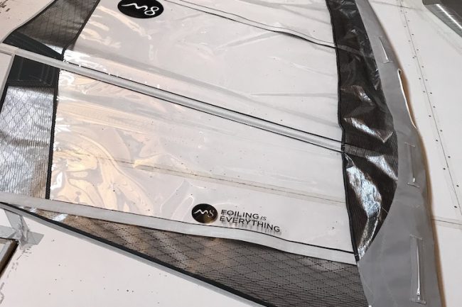 The panels are from monofilm, and the head and the foot ones are made of technora laminate with 1.5mil film. The two big load patches on the clew connecting the 3rd and 6th battens, the luff panel, and the mast sleeve fairing are from the same material.